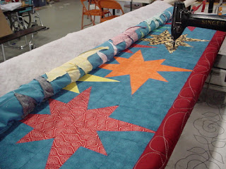 Leona shared 12 orphan blocks and challenged me to use them soon. Well--ta-da! My first stitch in the ditch project in a long time. Thank You to Francis for pinning all the safety pins!